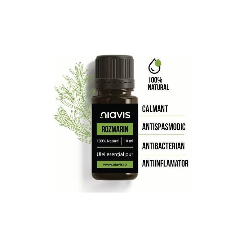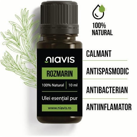 Ulei esential de rozmarin Niavis, este compus din planta puternic aromata, usor picanta si lemnoasa de rozmarin. Rozmarinul este utilizat inca din vremurile antice, datorita propietatilor sale medicinale.