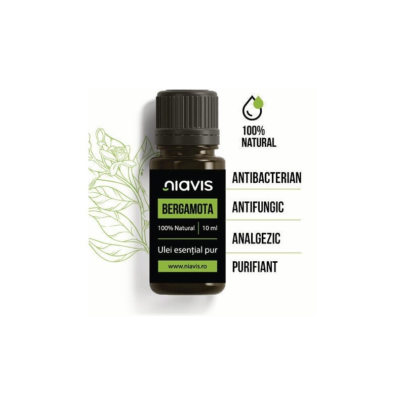 Uleiul esential de bergamota- Niavis este obtinut din arborele tropical Citrus Aurantiumvar. Acesta este adesea folosit in parfumuri si este ideal pentri aromaterapie, contribuind la o stare de bine, relaxare si sentimente de fericire.