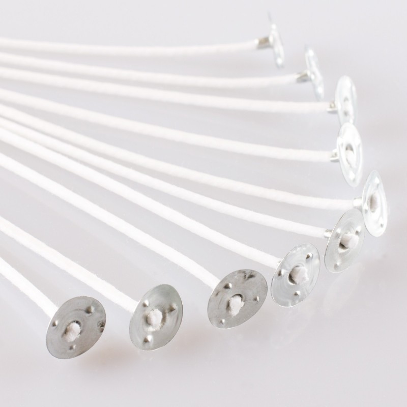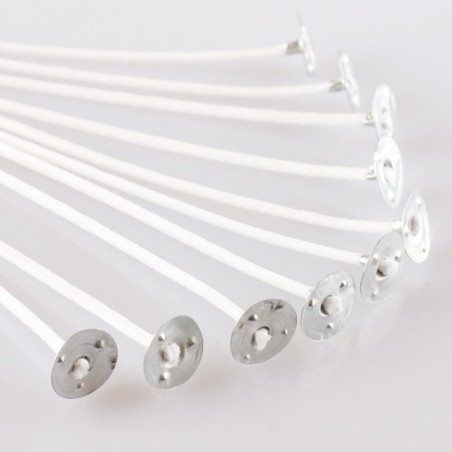 Un set format din 10 bucăți de fitil de bumbac învelit cu ceară de soia și capse metalice montate, potrivit pentru realizarea de lumânări. Lungime fitil 15 cm.